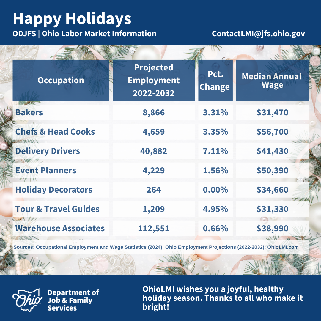 Ohio’s Labor Market Information wishes you a joyful and safe holiday. Check out occupations that help to make the season bright.